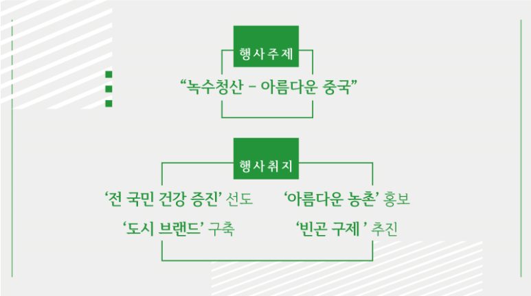 본 행사의 주제는 녹수청산( 綠水靑山) - 아름다운 중국의 지역을 주제로, 행사 취지는 1. 전 국민 건강 증진 선도 2. 도시 브랜드(인지도) 구축 3. 아름다운 농촌 홍보 4. 빈곤 구제 추진 입니다!