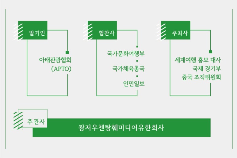 행사의 주관사는 광저우첸탕훼미디어유한회사(광동첸탕문화미디어유한공사)가 주관하며, 공동 주관사로는 홍콩 신화그룹, 광동 Qiaolianpu 문화예술유한공사 발기인은 아시아여행연합회(이하 아태관광협회, APTO) 협찬사는 국가문화여행부, 국가체육총국, 인민일보(국가정부/기관) 등 주최사는 세계여행 홍보 대사 국제 경기부 중국 조직위원회 입니다. |