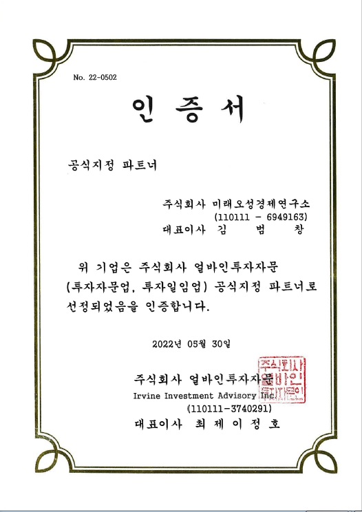 MiraeOhsungGroup Official Designated Partner Certificate(Irvine Investment Advisory)